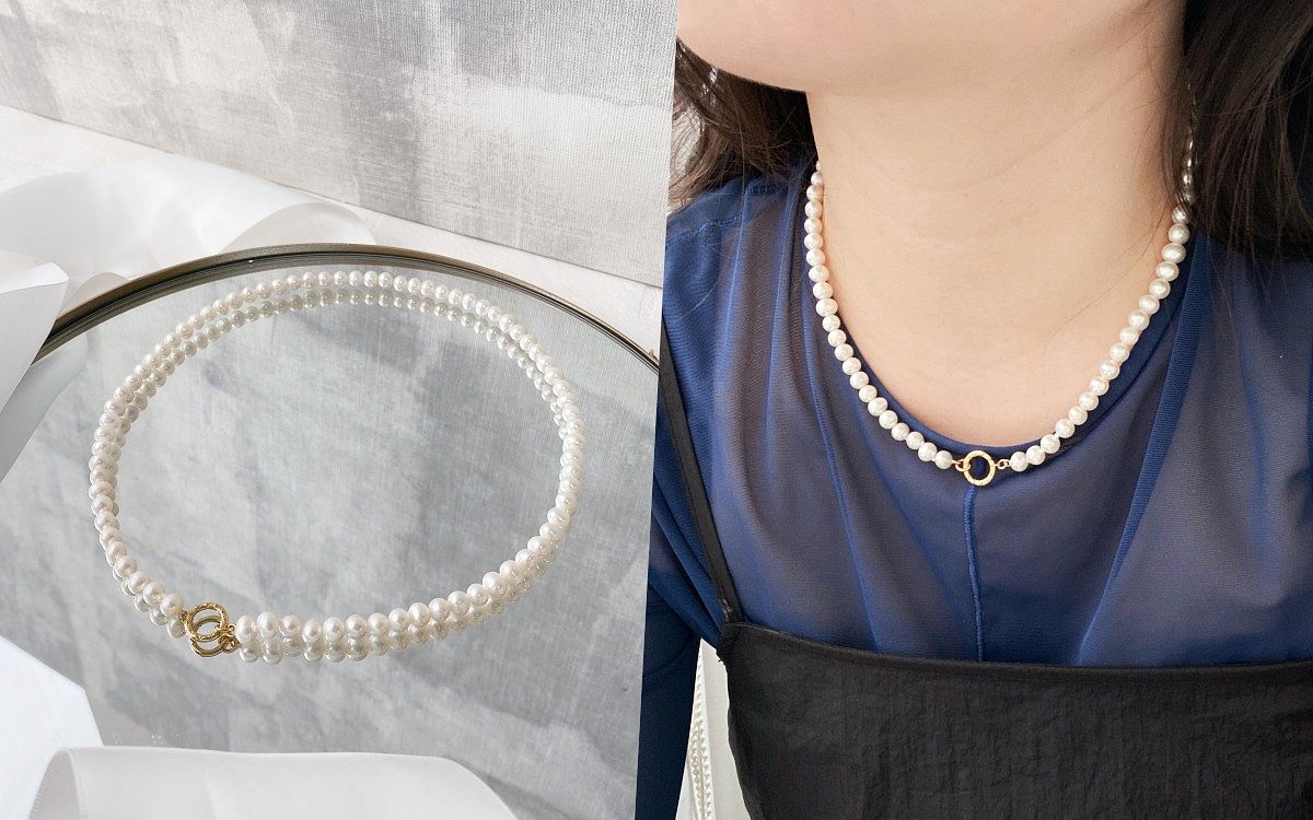 除了耳環與手鍊外,亞立詩兩款珍珠項鍊也是詢問度極高的人氣單品!氣質大人感的V型垂墜項鍊,金珠與7-7.5mm AKOYA珍珠相互輝映,延長的鍊身使得整體項鍊的視覺線條拉長,不只修飾臉型更加顯得高貴優雅,且可透過移動式的金珠調節項鍊長短,配合服飾的領口做上下的伸縮超級百搭。另外用一顆顆珍珠起的圓舞曲項鍊,在脖子上圍繞出俏皮可愛的線條,讓珍珠宛如繁星點點,為十足的女人味增添一絲活潑氛圍。