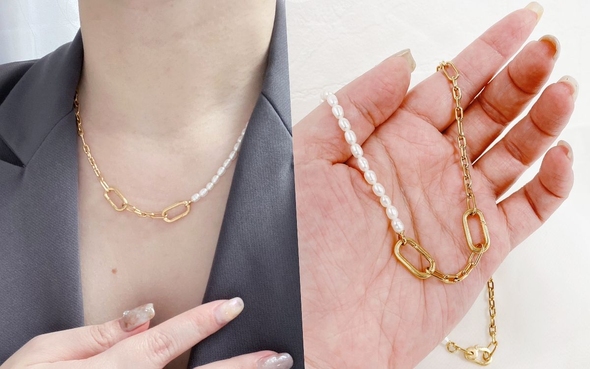 agete珍珠項鍊以兩款尺寸大小不同的珍珠創造截然不同風格的百搭飾品,SV珍珠項鍊以較大直徑的珍珠搭配雕刻細膩花紋的圓形扣環,可以作為前方墜飾也可配戴在頸後,存在感十足卻又典雅時尚,可替穿搭輕鬆增添時髦細節,另外K金細鍊與較小珍珠穿插的項鍊則更加百搭日常,無論任何風格、需求場合都能零失誤搭配。