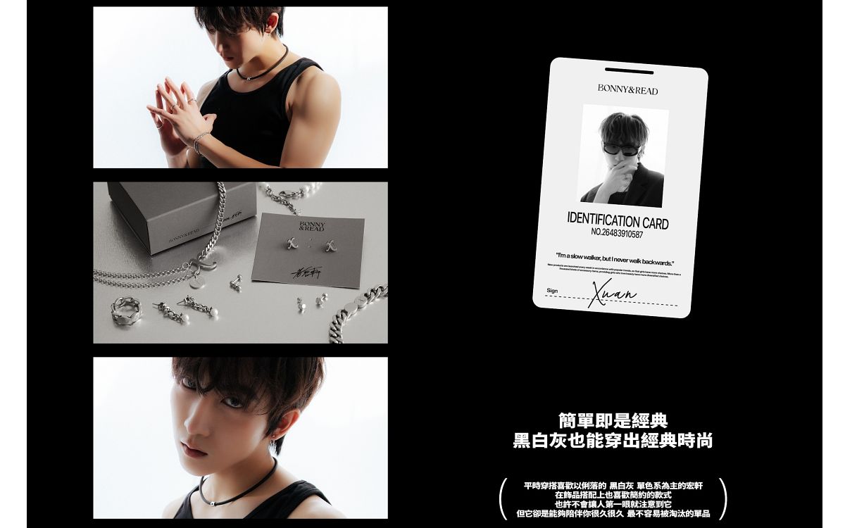 過去曾飾演《飛魚高校生》、《青春有你》的黃宏軒,優異的運動表現更讓錢薇娟欽點為《全明星運動會》第四季的藍隊狀元,無論球類、田徑、游泳賽事樣樣精通,擁有182公分的修長身高、陽光的笑容,以及精實好身材,在穿搭上更有自己的一套想法,本次BONNY&READ能與黃宏軒促成飾品的聯名合作,也是宏軒首次跨足飾品領域,如同這次的設計理念是商品上有字母X,除了是名字中軒Xuan的英文開頭,也有無限的意義,相信每一個人都有無限可能、無限的創造力、無限的機會,當飾品戴在不同人身上時也能有無限的可能性。