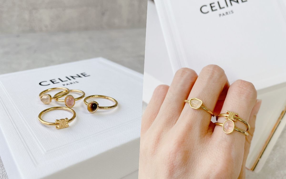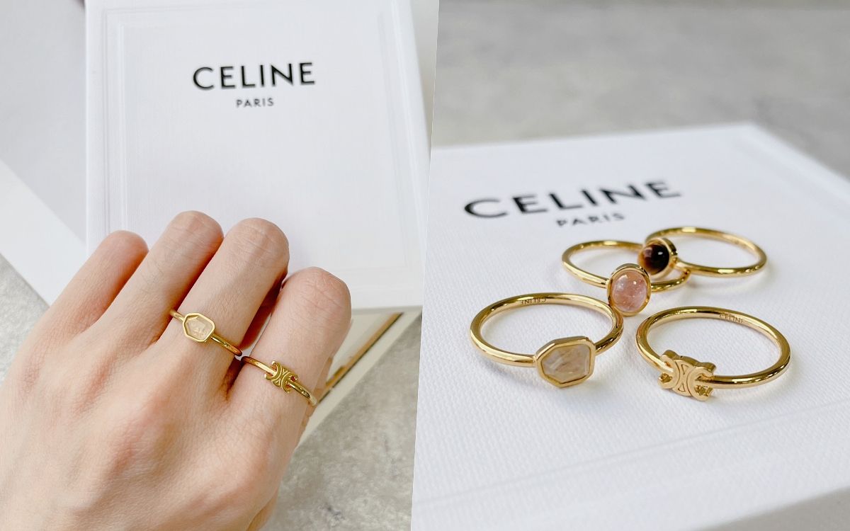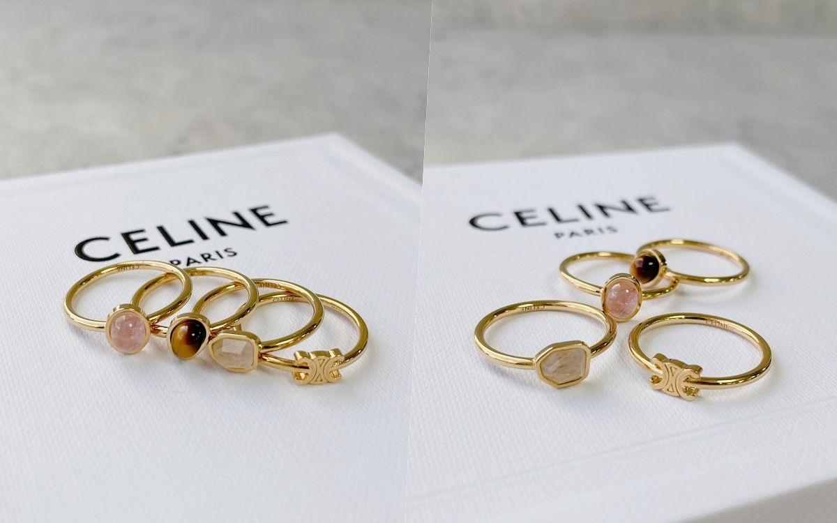 精品戒指是初入門品牌標誌性單品十分完美的首選,不管是當作禮物或是犒賞自己都很合適,推薦這組CELINE經典戒指,以黃銅、髮晶、粉晶及虎眼石裝飾而成,精緻又具層次、不管混搭或者單獨配戴都很時髦。