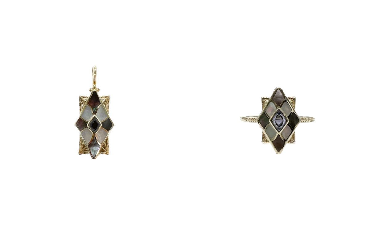 右:10K x 黑蝶貝 x 白蝶貝 x 堇青石 Grisaille 墜飾 NT$30,700
