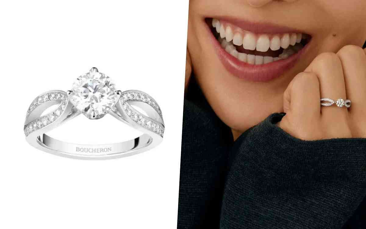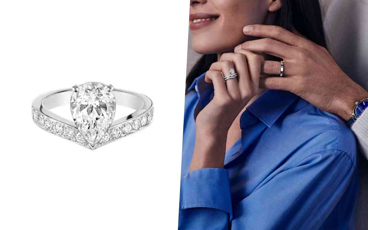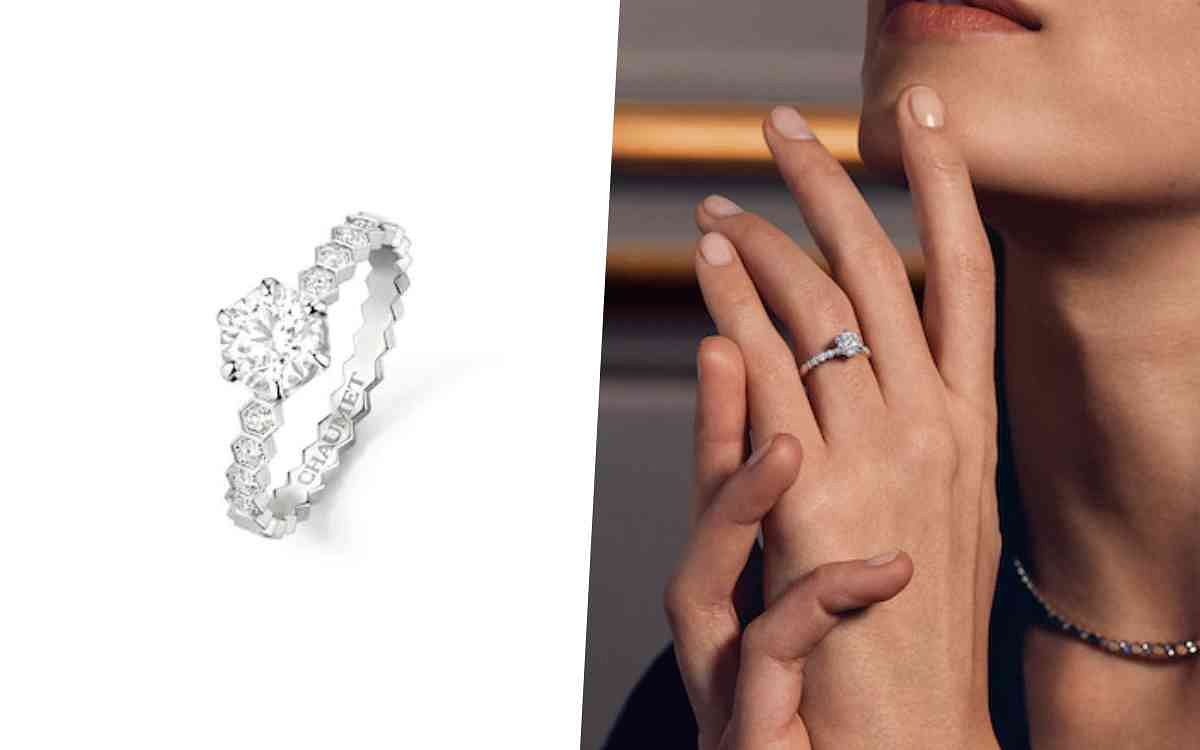 法國皇家御用頂級珠寶Chaumet以鑲嵌一顆梨形鑽石搭配戒環鋪鑲明亮式切割鑽石的Joséphine Aigrette鉑金單鑽戒指,打造出讓所有女性都為之驚嘆的復古華麗求婚戒,戴上很難不被它的獨特風采吸引,另外Chaumet極具標誌性的六角形蜂巢式設計的Bee My Love系列也有推出18K白金單鑽戒指,外形別緻且時尚現代,將品牌巴黎元素以蜂巢般的幾何圖形設計組合在一起,堪稱是蜂巢圖形基礎上最出人意料的創新之作。
