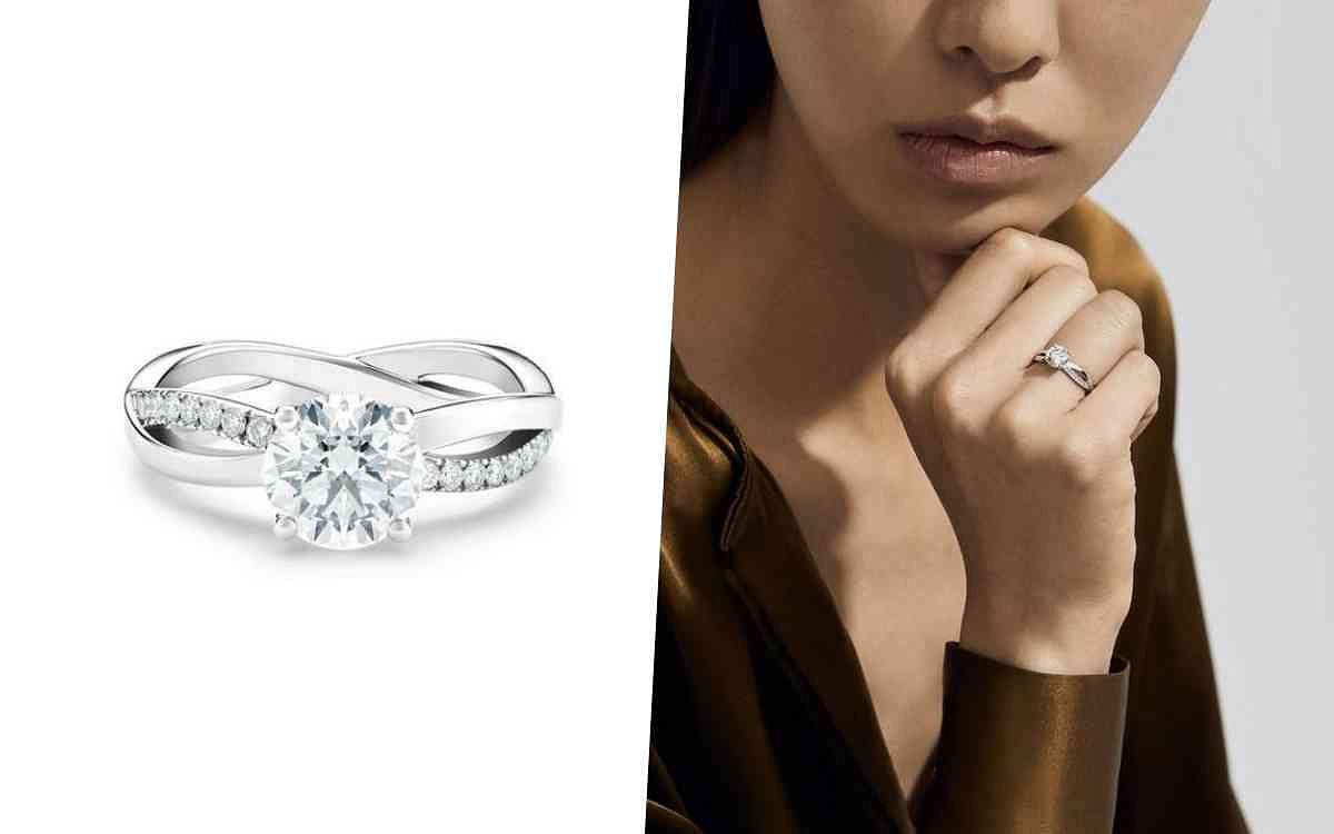 De Beers在這款圓形明亮式鑽石戒指上,以兩條交織纏繞的鉑金線條承載著承諾的主題,其中一條為精緻的圓形明亮式密釘鑲鑽,並在戒指中央以一枚圓形明亮式切割的主鑽引人注目,再低調簡約中創造出不凡的特色與魅力,想要有別於他人的求婚鑽戒就能選擇這款。