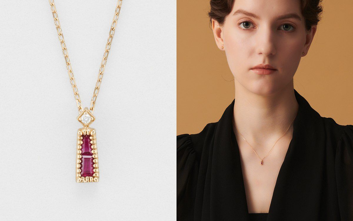 圖片來源:agete兩顆尖階梯形切割紅寶石層次拼排,巧妙地營造出整顆梯型單鑽的視覺錯覺。縱長形狀的墜頭佩戴在鎖骨處,氣質典雅。墜頭處鑲嵌的明亮式切割單鑽與梯鑽相互輝映,展現出獨特的火光。底座以千粒穀點綴,側面呈現一體成形的鋸齒鑽石座,整體設計運用巧思,巧妙展現一體兩面的效果。適合高雅且沉穩的女孩。