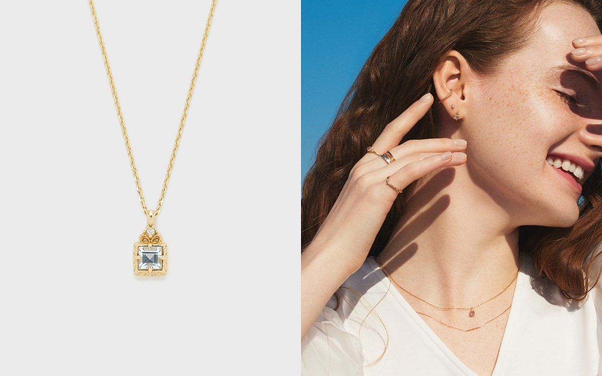 圖片來源:agete每年春季都會推出的海水藍寶石系列,此款項鍊將海水藍寶石切割成方形,彷如鏡子的折射,散發出耀眼的光芒。此外,項鍊還融入了古董鏡上的雕刻工藝,以細膩繁瑣的立體雕刻將葉子圖騰優雅地裝飾於寶石座上,如同春日晨露般晶瑩剔透,將自然的美麗與歷史的韻味完美融合。適合熱情並充滿想像力的女孩。