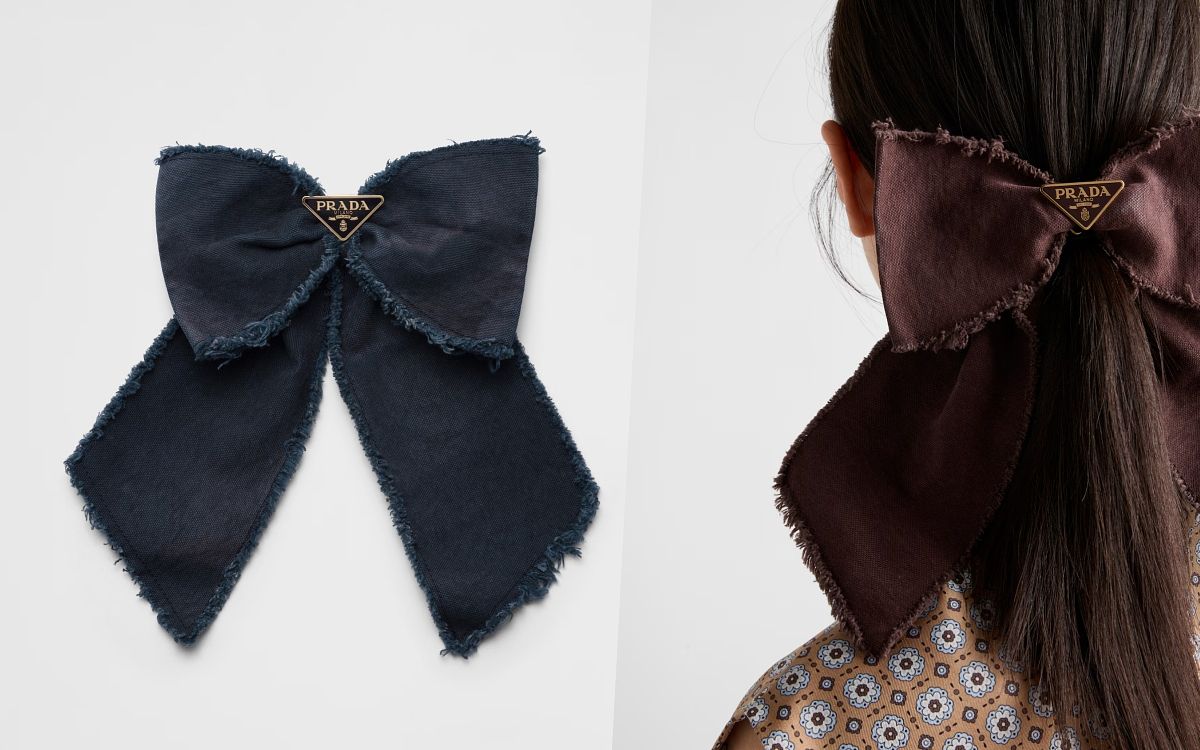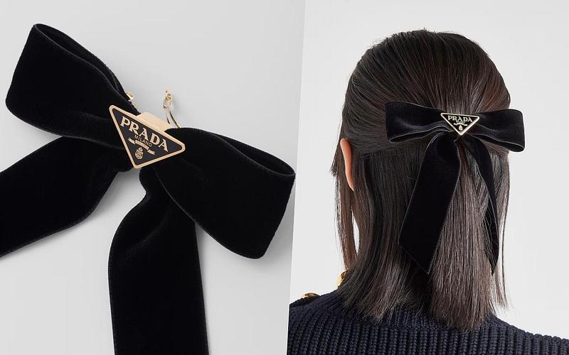 柔軟絲絨材質的PRADA蝴蝶結髮夾將品牌甜美但潮流個性的風格演繹得十分完美,同時飾有搪瓷金屬三角標誌,為這款精緻配飾增添經典元素,特別適合約會、正式裝扮時搭配,在細節處加入巧思。