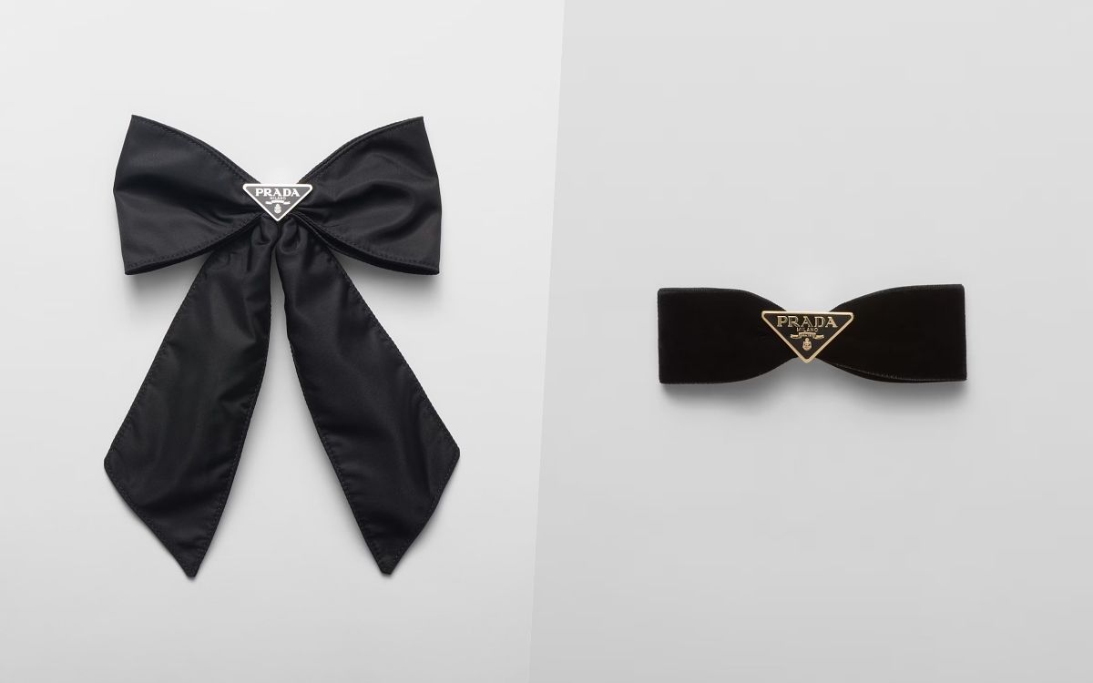 左邊款蝴蝶結髮夾以品牌獨有的創新再生尼龍面料Re-Nylon製作,綴以經典搪瓷金屬三角標誌,流露優雅又率性自然的氣質,而右邊款蝴蝶結髮夾以柔軟的絲絨製作,尺寸小巧更顯華貴精緻的氛圍。