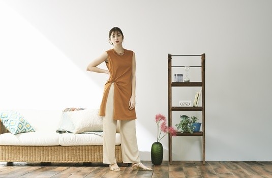 ▲橘色無袖長版上衣,下襬開岔的小設計,即使外出也能藉由簡單搭配奶茶色寬褲與小配件,輕鬆完成居家外出都合適的無負擔感時尚。