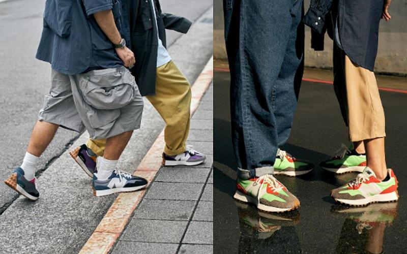 大力&Eddie這套穿搭中,腳上分別著用紫色的WS327COA以及鐵灰色的MS327SFB,兩人的穿搭分開看會發現他們像是獨立的個體,但擺在一起不知為何就是有種和諧感,一眼就讓人看出他們是情侶,這是因為327是採用色塊拼接的方式去做鞋面配色設計,大力腳上的紫色款採用紫色網布搭配黑色、灰色麂皮去做拼接,而Eddie腳上的鐵灰款,則是採用灰色網布搭配黑色、藍色麂皮拼接,大家有發現嗎?這兩雙的配色其實是有互相呼應的!