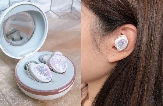 這是一款完全為女性設計的藍牙耳機,充電盒就像是女孩隨身攜帶的氣墊粉餅般圓潤可愛,打開耳機盒還貼心地附了鏡子,配戴耳機時能照著鏡子十分方便。充電盒與耳機本體都是霧白色的舒適質感,搭配粉色勾邊更是可愛加倍。這款耳機的最大特色在於將耳機視為時尚配件的概念,附上花漾和大理石紋路設計2種外殼,讓使用者能隨著服裝風格更換圖案!