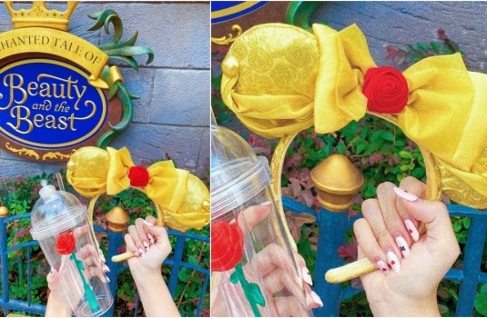 《美女與野獸》主題區開幕除了要珍藏超夢幻的爆米花桶之外,怎能少了每次入園絕對要戴上的迪士尼髮箍?《美女與野獸》園區限定款髮箍竟然是貝兒招牌的鵝黃色緞面材質,中間更點綴一朵嬌艷紅玫瑰,身為貝兒的粉絲一定要入手呀!此款售價日幣¥2,400,約台幣NT.660元(via:nakajima_natsuki)