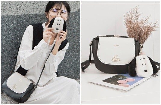 採用大小雙袋結構式拼接設計,前幅外袋內附插袋隔層,分類收納的實用度及獨特的視覺感兼具。貼合身型的輕巧扁型包款設計修飾身型OK!史努比和胡士托以立體金屬印刷圖樣呈現,背面印刷愛心LOGO點綴黑色,正反面隨著心情自由變換使用。