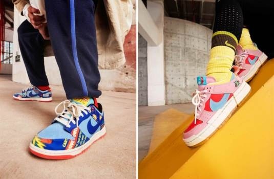 多樣的鞭炮圖案為2021新年系列鞋款增添了獨具風格的亮點。Dunk OG鞋款和女款Dunk Low Disrupt鞋款採用富有層次感的鞋面設計,其靈感來源於鞭炮包裝紙。鞋舌處飾有危險警示標籤,鞋帶部分則運用了褶皺紙張紋理。