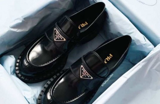 PRADA櫃上搶翻天的鞋就是這一雙!以經典Penny Loafer便鞋為靈感,明顯的圓弧鞋頭搭配橡膠厚底,打造出這雙完美的長腿樂福鞋,正面綴有搪瓷金屬三角形標誌,不僅讓人一眼就能辨識,三角形在視覺上還能同時更顯瘦,隨意搭配襪類就很有型!