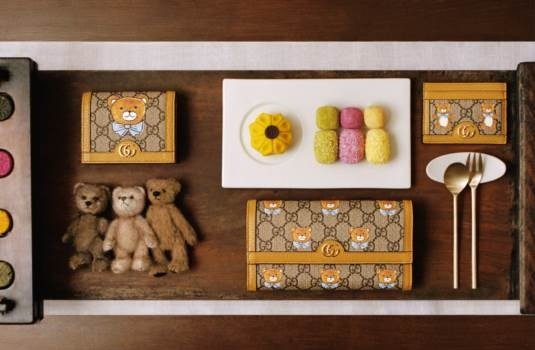 品牌經典行李箱與包款也都以可愛的泰迪熊形象變幻出迷人造型,它時而以全身造型佔據箱包主要畫面,時而以大頭照造型點綴箱包表面,但都成為米黃色/烏黑色GG Supreme帆布上的俏皮點綴。所有箱包款式都飾有與泰迪熊相近配色的橙色皮革飾邊。包括小型托特包、中型托特包、迷你水桶包、小型肩背包、腰包、相機包、公事包、大型行李箱等多樣選擇。小皮件皆由GG Supreme帆布製成,飾有泰迪熊圖案與橙色皮革飾邊,包括長夾、短夾、手機袋及化妝包。