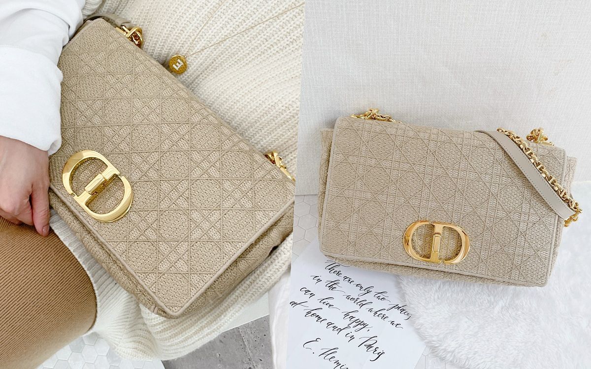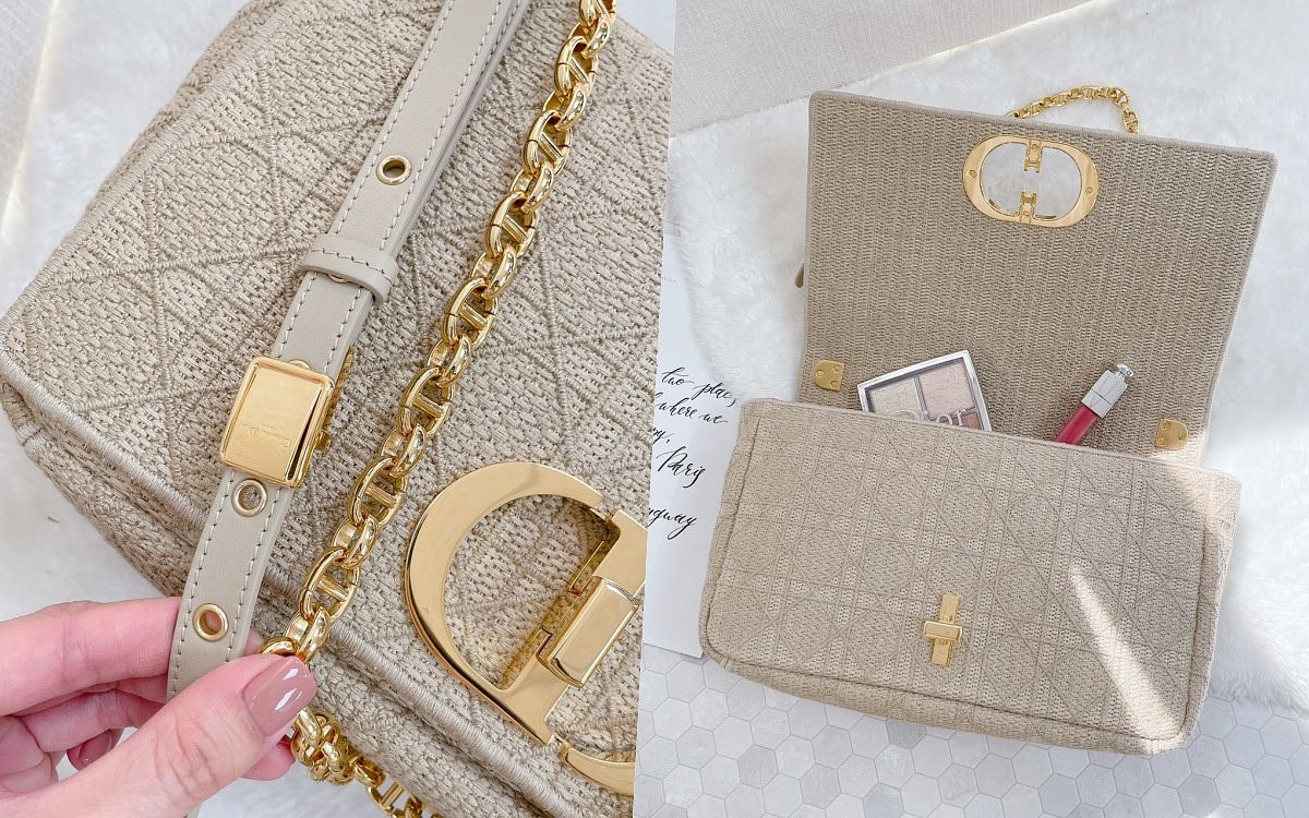 DIOR CARO BAG縈繞著滿滿仙氣、更彷彿優雅的化身!包身以經典Cannage藤格紋刺繡圖案細膩打造、奶茶色更是將溫潤兩字徹底彰顯,包款復古金色調的LOGO靈感來自於Christian Dior香水瓶封口,鏈帶也以同系列「CD」兩字設計,絕對是年度不能錯過的DIOR新作品。