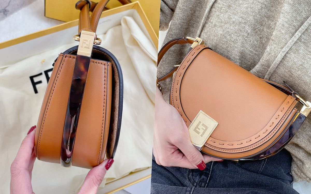 FENDI新一季推出的迷人包款,以純牛皮手工縫製、FENDI精湛工藝自然是無可挑剔,包款獨特的半月形輪廓融合了復古韻味與都會洗鍊質感,線條流暢之外細節滿佈,夾心感的玳瑁拼接更為包身增添層次印象。