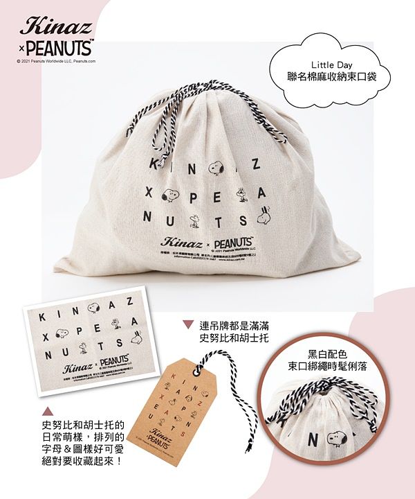 全系列包包都附有精織棉麻材質的全新聯名收納束口袋,袋面上印著史努比和胡士托的日常萌樣,排列的字母及圖樣好可愛,搭配黑白配色時髦俐落的束口綁繩,連吊牌都是滿滿的最愛,絕對要收藏起來呀!