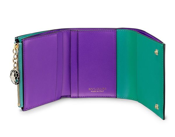Serpenti Forever祖母綠色小牛皮短夾,薰衣草紫水晶色內襯,搭配黑色與白色琺瑯,蛇眼飾以孔雀石綠色琺瑯。