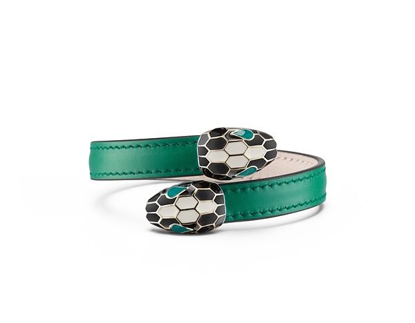 Serpenti Forever祖母綠小牛皮手環,經典蛇頭搭配黑色及白色琺瑯,蛇眼搭配孔雀石綠色琺瑯。
