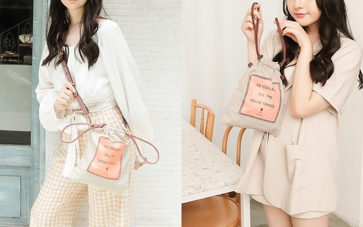 袋面上印有法式優雅粉紅葡萄酒印刷圖樣,以配色質感皮革作為束口繩,增加精緻度且輕鬆好開收!袋子兩側附皮革耳仔x D型金燦釦環,搭配包款的皮革斜背帶就能變身輕巧時尚斜背包。