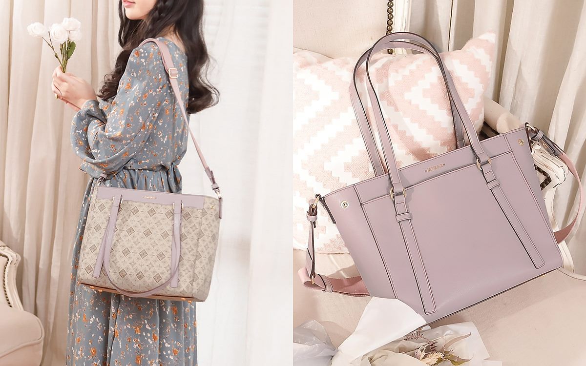 經典老花LOGO拼接迷人粉紫色系,2way斜背/肩背托特包。寬版織帶背帶 舒適好背,扣上包身兩側壓釦可變換包型。通勤 / 購物大容量空間可放A4文件!