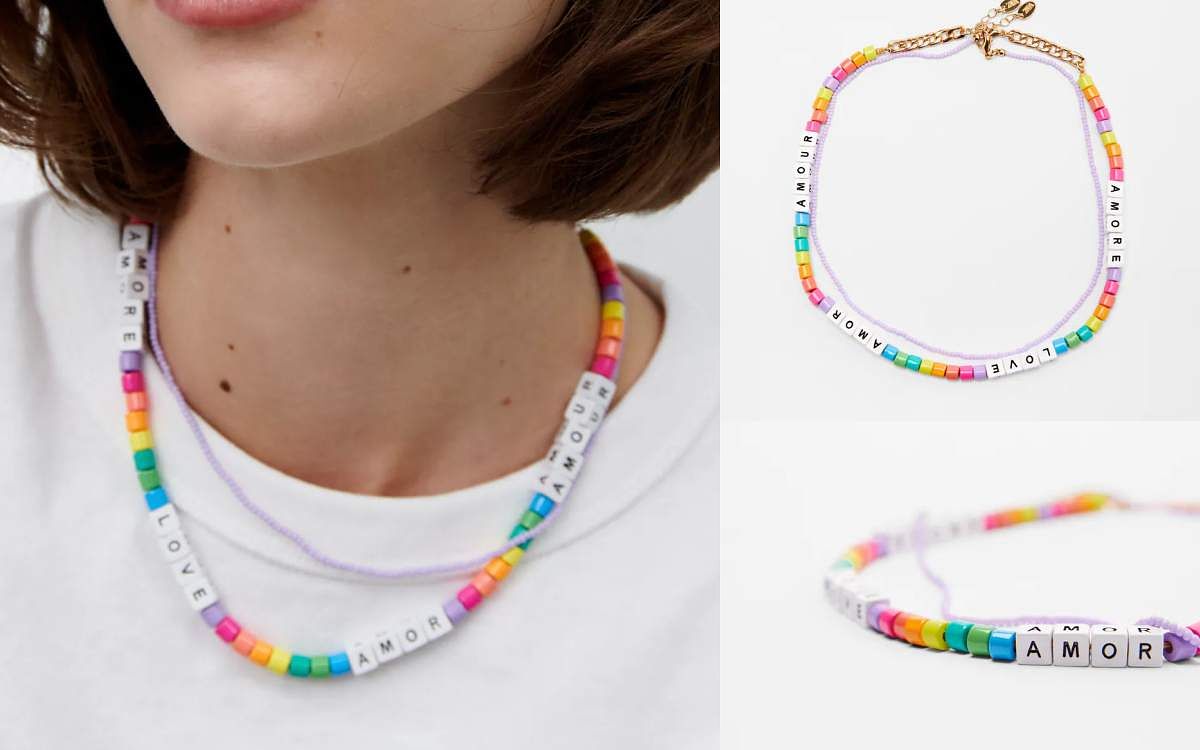 拼接多色小串珠,以及LOVE與AMOR等字母,看起來活潑又可愛,另外再搭配金屬材質的項鍊也很好看。