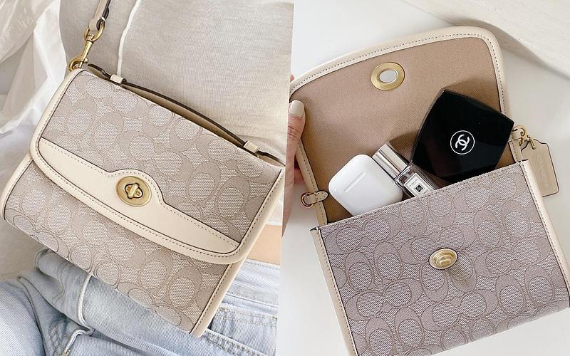 這款淺奶茶色調的老花郵差小包,以COACH經典識別轉扣帶出復古印象,將老花帆布與精緻皮革相互拼接、皮革肩揹帶也為可自由拆卸的設計,足以應付多種不同場合需求,包身上並附有手拎提把,是一枚實用性與外在兼顧的完美包款。