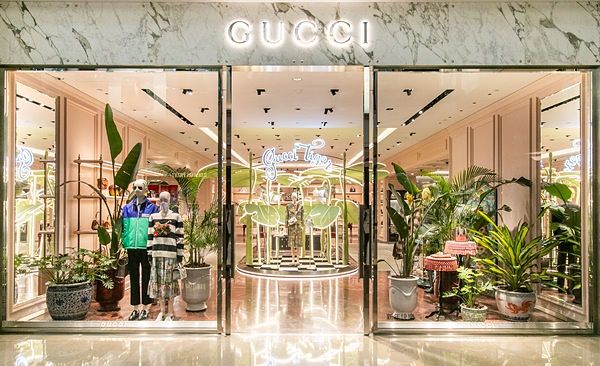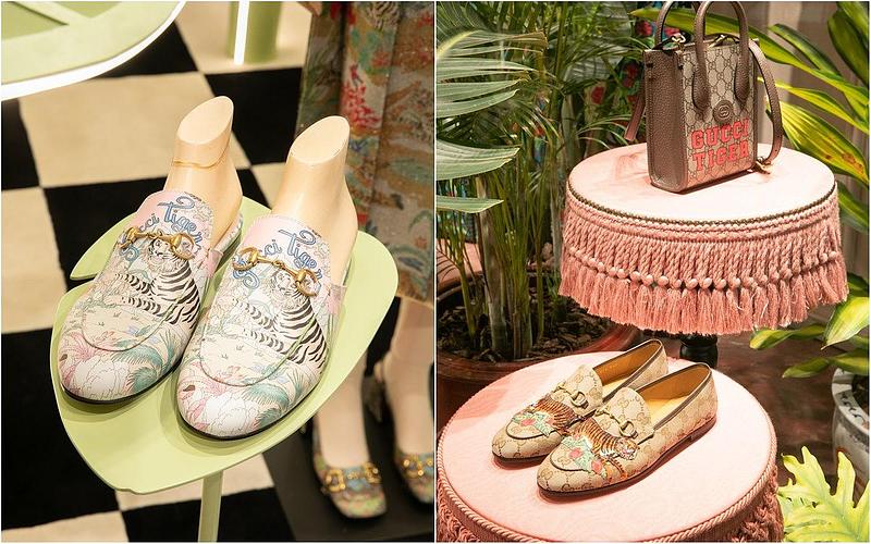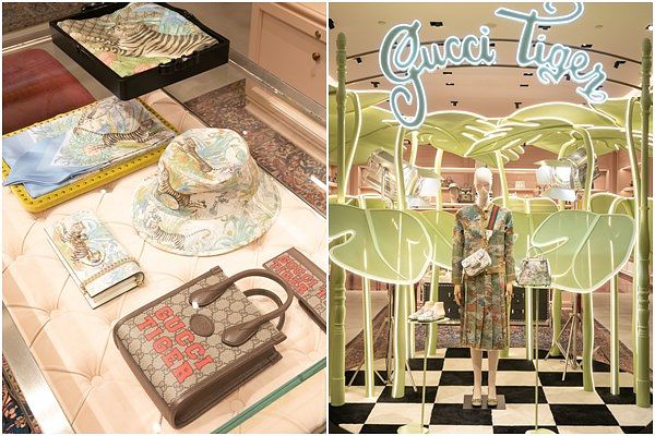 虎年新春主題系列將於1月4日正式推出,於全球Gucci專門店的主題櫥窗及期間限定店登場。虎年系列限定店的室內佈置靈感向系列其中一款印花取材,入口豎起閃亮「Gucci Tiger」燈牌,引領訪客走進儼如森林的空間。以LED燈勾勒的大塊樹葉構成綠意盎然的樹蔭,與店內的黑白格紋地板形成優雅對比。