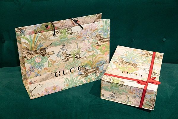 虎年新春主題系列的產品包裝同樣換上獨家限定的主題元素,包括風格一脈相承的禮盒、購物袋、封套、不同形狀和大小的包裝袋,以及飾有Gucci Tiger碎花圖案的標籤。為貫徹Gucci永續發展的願景,所有購物袋均採購自負責任管理森林的紙張,提繩採用100%循環再造聚酯纖維製造,並以打結方式繫於袋上,避免使用膠水。最後,所有緞帶皆以100%有機棉巧製。
