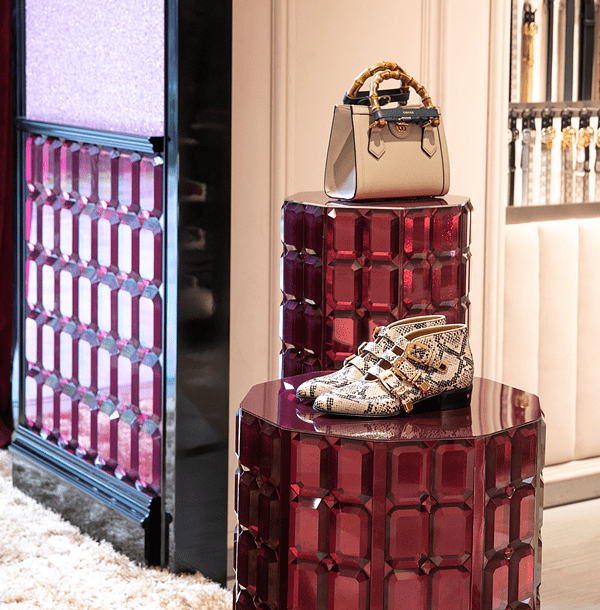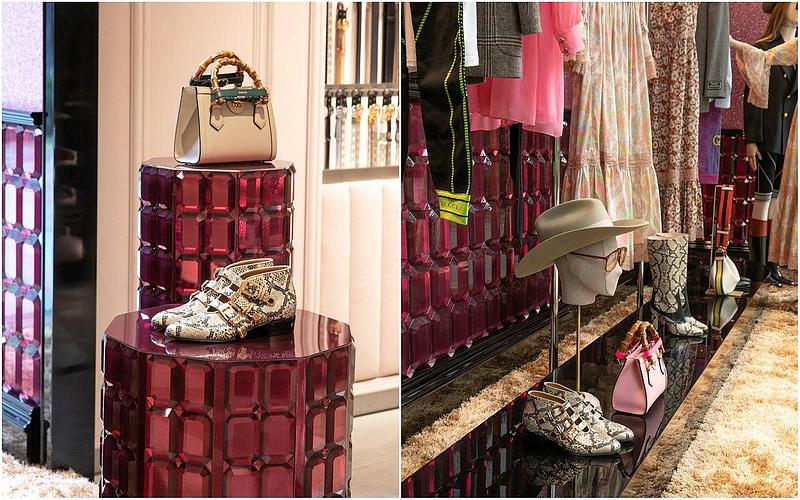 店中店生動展現了去年好萊塢大道上Gucci Love Parade大秀的華麗與璀璨,閃亮質地的牆面與寶石般切割而成的磚牆相互輝映,搭配上羊毛地毯,交織出既和諧又衝突的美感,為店中店增添高雅舒適的氛圍。