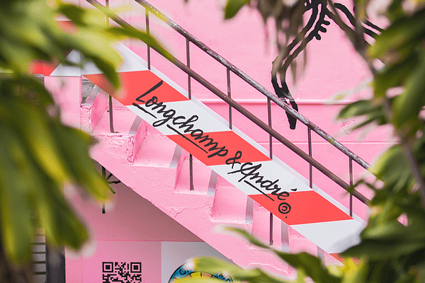 Longchamp 將於台中審計 368 新創聚落打造 LONGCHAMP & ANDRÉ 聯名系列裝飾藝術,即日起已可陸續在村內看見各式打卡拍照點,活蹦亂跳的 Mr. A 穿梭於紅磚牆上,Longchamp 更運用村裡一大面的白牆,刷上 André Saraiva 最愛的粉紅色並將大大的 Mr. A 躍上牆面,帶著高禮帽的 Mr. A充滿活力地隨著樓梯旁紅白相間的聯名緞帶漫步下樓,一旁還有聯名系列的圖騰 Logo,牆上更打著 LONGCHAMP & ANDRÉ 迷幻霓虹光,吸睛迷人的粉紅炫光渲染了村裡各個角落,營造法式浪漫的街頭潮流氛圍。Longchamp 以繽紛色彩與趣味塗鴉,將佈滿 Mr. A 的台中審計新村煥然一新,除了主題快閃店外,村落裡還設有主題數位互動區,讓 Mr. A 躍上大螢幕與眾人一同玩耍較勁,另外更將打造佈滿 Mr. A 圖樣的視覺藝術塗鴉走廊,成為今夏最法式街頭的熱門打卡點,透過這些藝術裝飾引領眾人進入新奇趣味的塗鴉世界,Mr. A 的所及之處,都充滿了幽默詼諧的歡樂氛圍!LONGCHAMP & ANDRÉ 藝術聯名系列自 4 月 26 日 (二) 起於全球 Longchamp 門市及官網同步發售,並於 4 月 29 日到 5 月 15 日於台中審計 368 新創聚落立體廣場開設為期兩週的快閃店,引領眾人一窺無限創意的繽紛魅力。