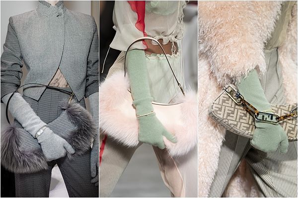 在 Silvia Venturini Fendi 設計的配飾中,品牌通過 「hand in hand」項目的全新篇章,以及皮草鑲嵌工藝製成的 FENDI First 包款與超大號購物包款,來傳達出對於手工技藝的推崇。為慶祝 Baguette 誕生 25 周年,FENDI 運用新材質精心復刻了三款倍受喜愛的包款:山羊絨款、羊毛皮加襯皮革款與嵌花水貂皮款。