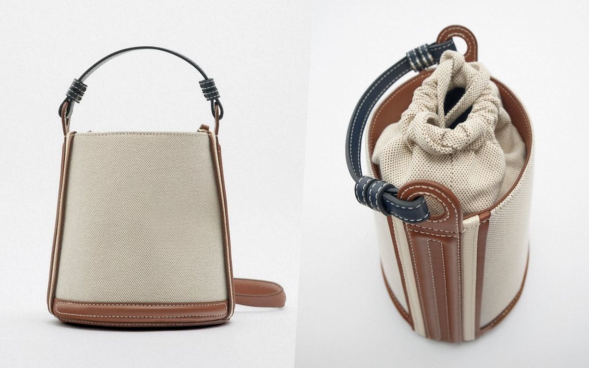 另外ZARA還有這顆水桶包,也是以硬質棉布料製作,搭配棕色、黑色皮革綴以包邊與提把、背帶,包型以開口、內帶抽繩封口方式設計,比起前一款更加休閒日常,米杏與棕色的撞色搭配也減少了都會俐落感,整體更適合不同風格的人使用,提把部分也特別以黑色增加獨特的細節呢!