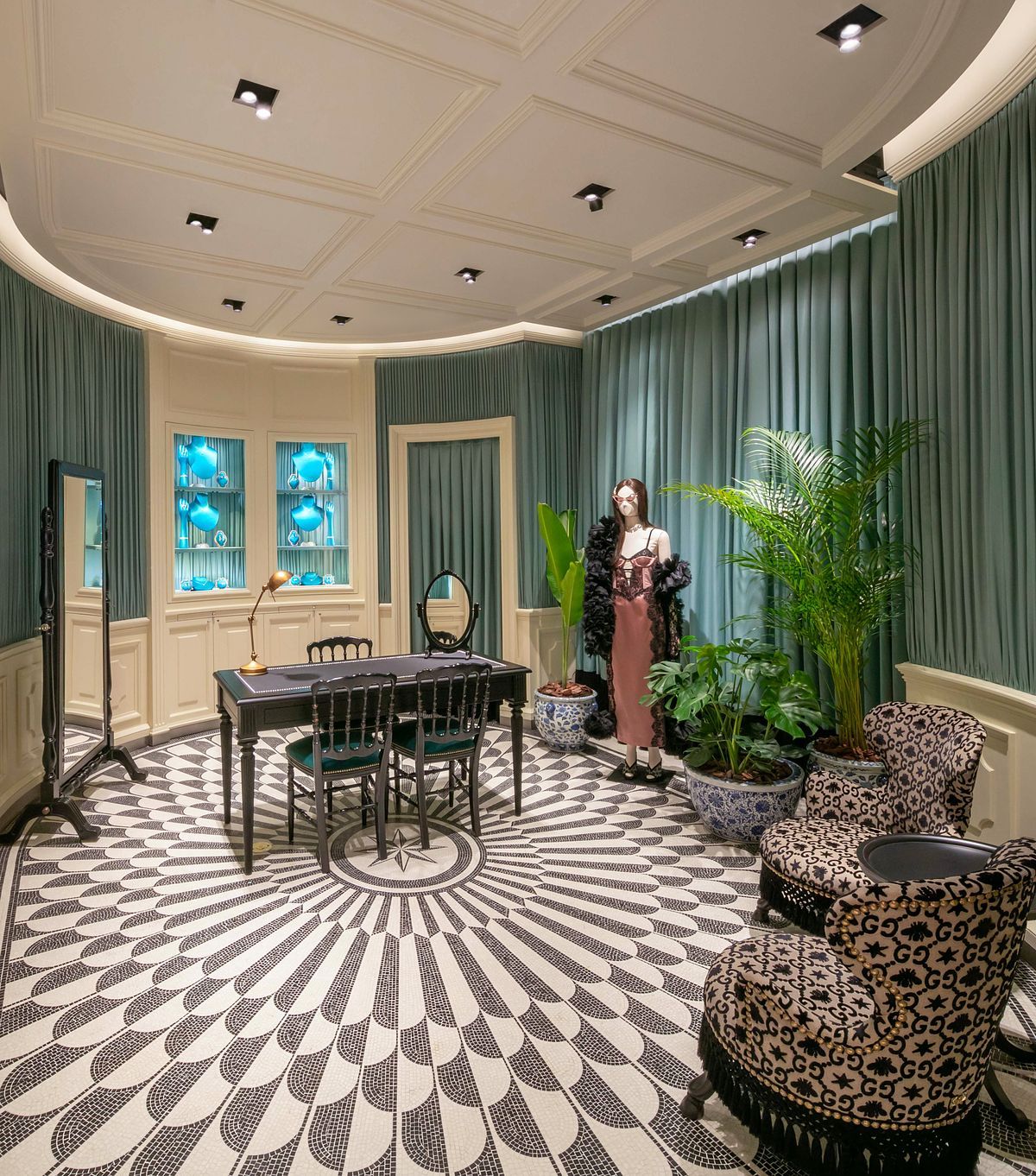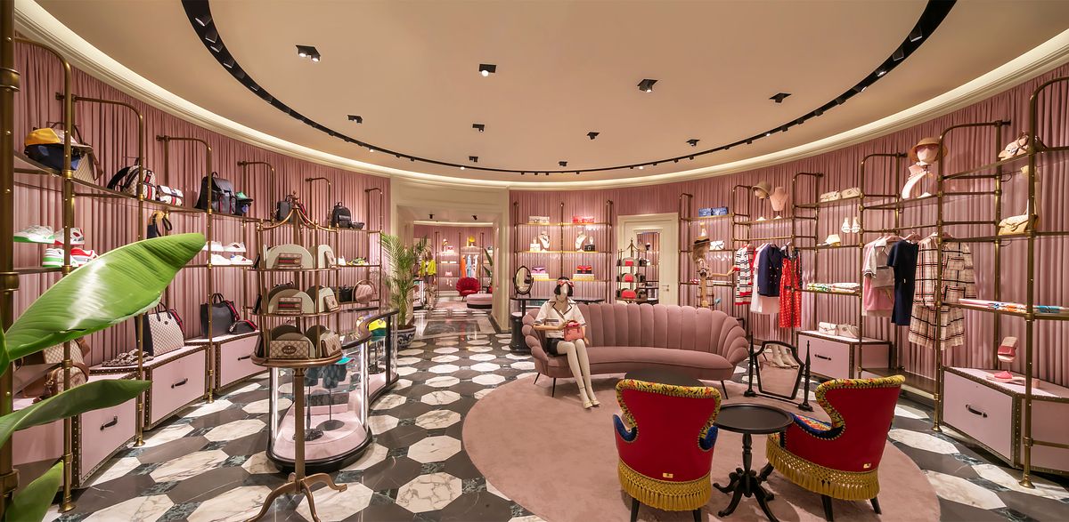 專門店中的家具皆經過精心挑選,令人耳目一新的材質組合營造出戲劇性的低調奢華氛圍。彩色大理石鑲嵌地板呈現出漸進的立體效果,與柔軟的牆面相互交融,帶來引人注目的豐富質感。這種看似衝突卻又意外和諧的裝飾性效果遍布每個購物空間,如工業金屬風的展示櫃與溫潤復古的木製古董家具、圓形與矩形的桌子並列展示皆形成鮮明的對比。奢華的天鵝絨扶手椅和沙發,與鋪在地板上的天鵝絨地毯相得益彰,營造出專屬於Gucci神秘且驚喜的視覺體驗。