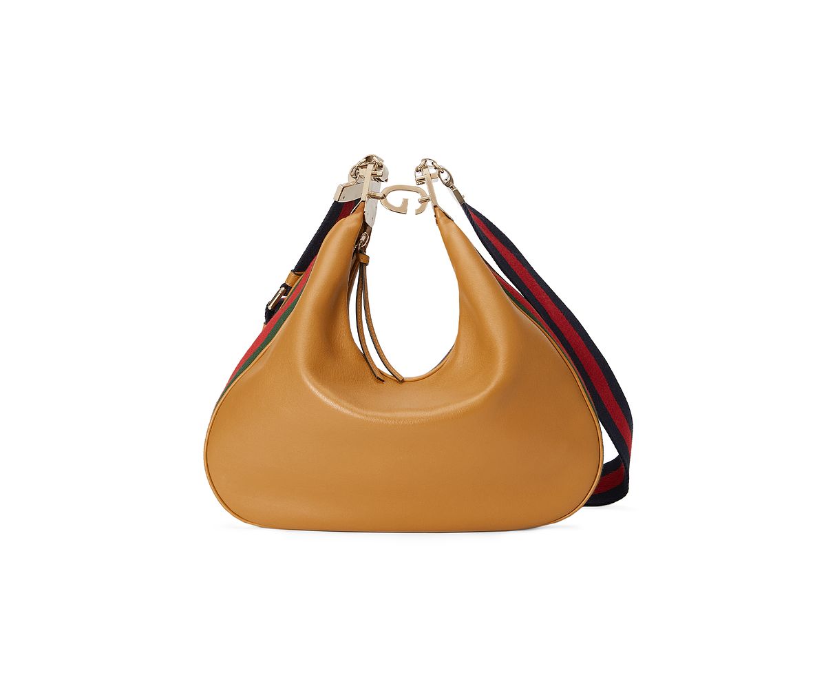 其半月型的輪廓設計來自於創意總監 Alessandro Michele 對於 1975年的經典款式的重新演繹。「Attache」名取自法文「鉤子」之意,扣環以G字造型點綴,充分詮釋傳統及品牌符碼;透過故事和姿態,超越性別及年齡上的限制,完美體現了70年代的感知和態度。