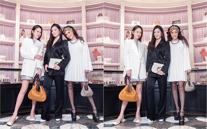 此次榮幸邀請許久未公開露面的演員林熙蕾、率性女星關穎,以及時尚媽咪 Melody,藉著開幕活動齊聚一堂,享受品牌流淌在時裝及生活品味的優雅格調。三位女星不僅在現場展現閨密交情的絕佳默契,也藉由不同的 Gucci 風格造型,傳達心中對於新時代女性的定義。林熙蕾身穿一席黑色套裝,一顯俐落高雅;關穎的百摺短洋裝,及腳上的復古龐克高跟鞋,充分展現她率真的個性;相比平時節目上所見的淑女風格,Melody則換上銀色亮片套裝,外搭白色寬版西裝外套,精緻且優雅。三人皆透過 Gucci 單品展現自身的時尚好品味,更藉由各自搭配的包款,以畫龍點睛之姿點出高衣Q。