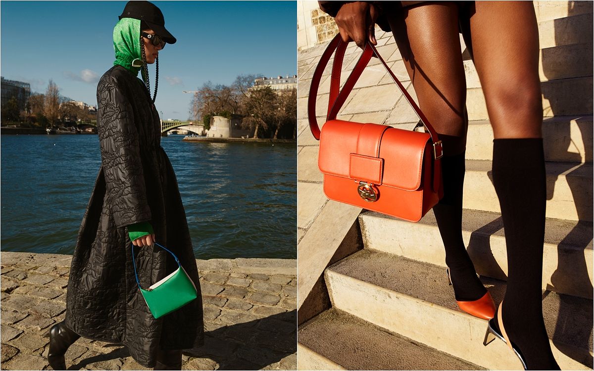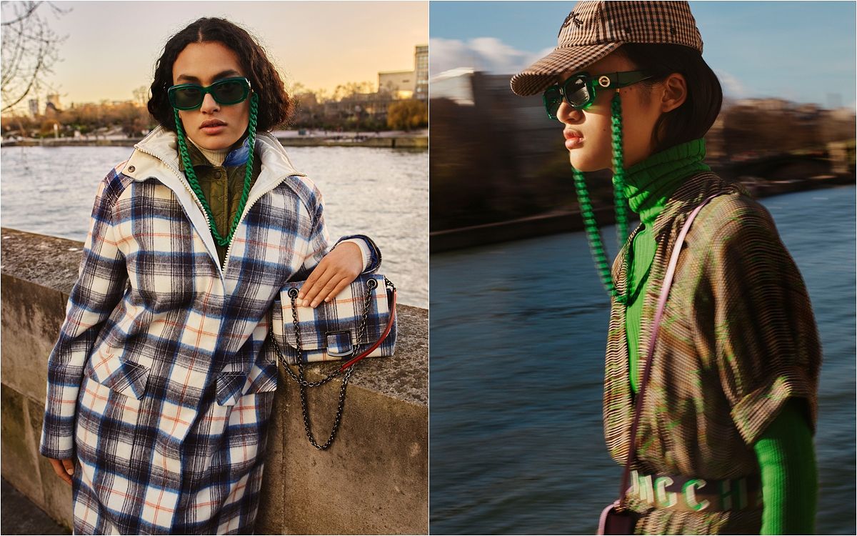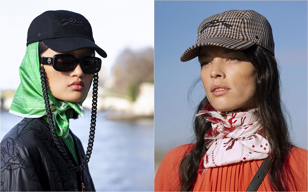 巴黎精神在秋冬系列的主要配飾中同樣隨處可見,特別是棒球帽。棒球帽早已從運動裝備轉變為時尚宣言,戴上一頂繡有超大奔馬圖騰的羊毛混紡傳統格紋帽子、或選擇經典黑色或醒目的橘色法蘭絨,來遮擋冬日的陽光。棒球帽下搭配色彩鮮豔的絲巾來演繹傳統與現代的對比,滿佈Longchamp 騎兵隊的奔馬圖騰絲巾,採用如寶石般閃耀的綠色、橘色或藍色。另一種設計則採用 Longchamp小型奔馬組成錯綜複雜的漩渦圖案,在流蘇邊緣嬉戲地疾馳,其別緻的藝術風格可隨意打在脖頸之間或搭配舒適的針織衫。而所有配飾都不會比一副亮眼的太陽眼鏡更受歡迎,半透明的大膽矩形鏡框,不論是橘色、綠色、淺粉色或是不透明的黑色,皆搭配協調的粗鏈,營造時尚復古外觀;最後以 Longchamp 的金色圓形奔馬圖騰畫龍點睛。
