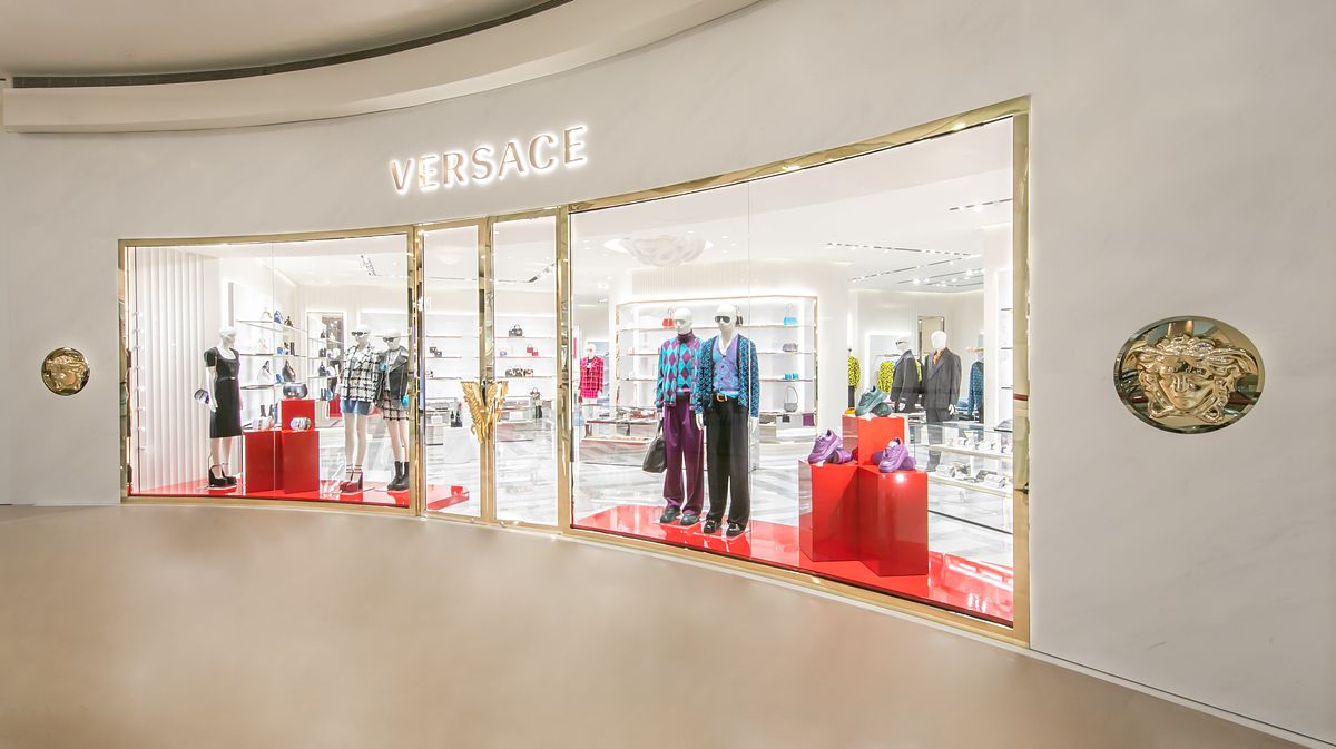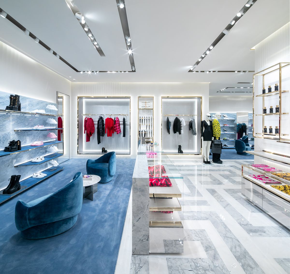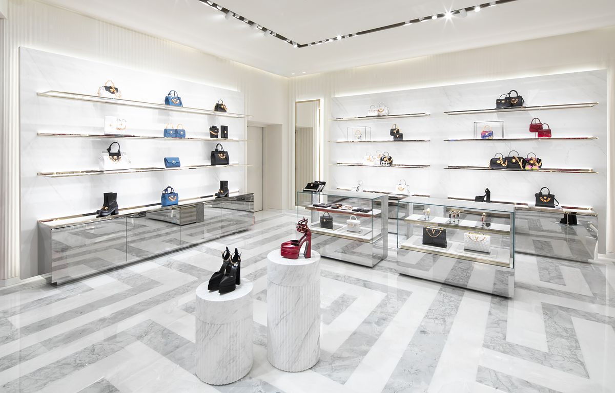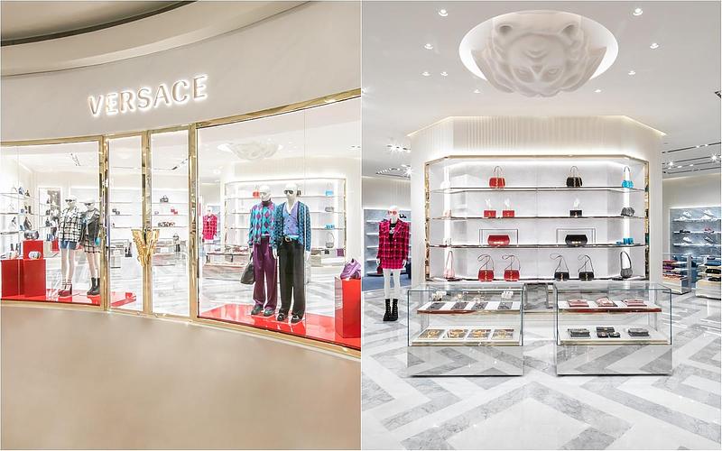 VERSACE 重新打造全新專門店,佔地 81 坪(267 平方公尺)完美展現 VERSACE 極致的品牌風格:以大理石、絲綢和金屬質感貫穿整個空間,體現古典與現代交融的華麗時尚氛圍。白色牆面以凹槽木板裝飾,全新專門店的擺設以拋光金屬質感和白色陶瓷裝飾而成。鋪著藍色地毯的區域與藍色方解石大理石的鋪設相得益彰,地板上印有品牌標誌希臘迴紋裝飾細節,古典高雅的象徵完美地詮釋 VERSACE 奢華性感的魅力。全新的專門店同時展示 VERSACE 2022 秋冬最新且齊全的男女服裝及配件系列及香水系列商品。