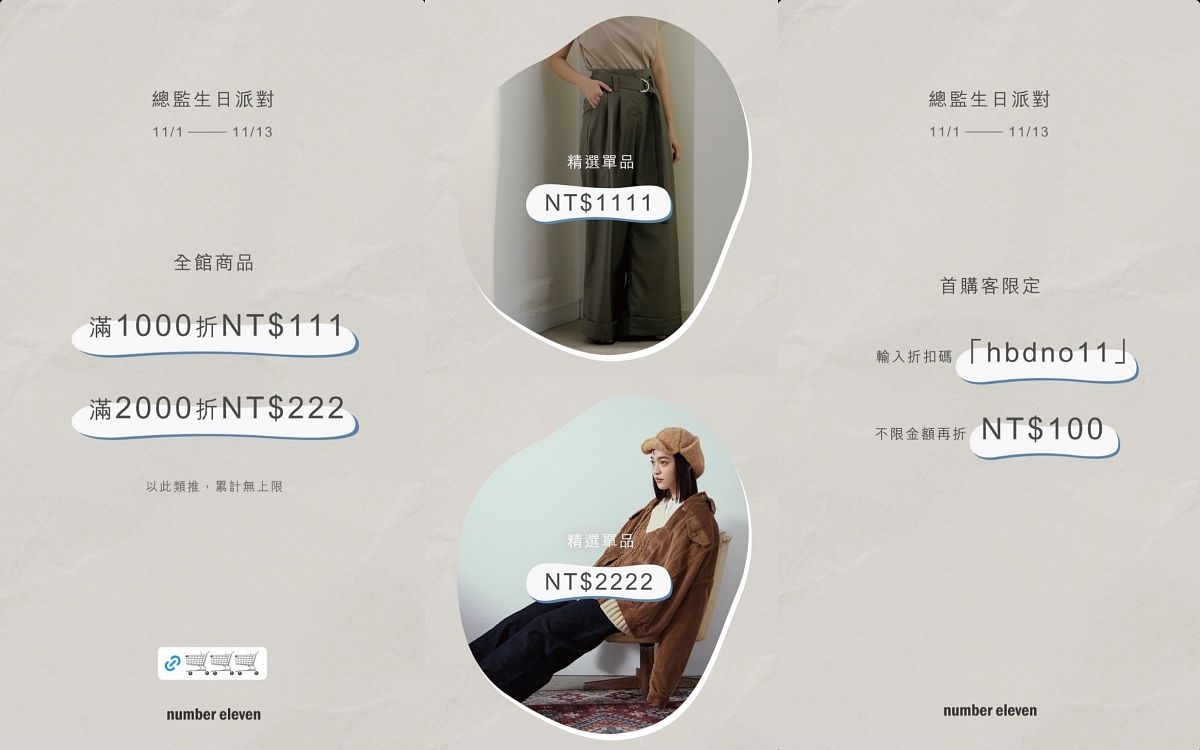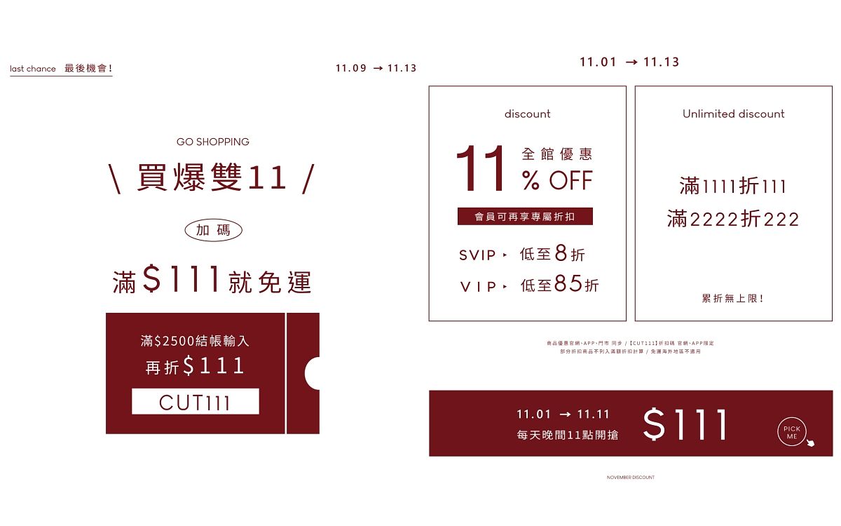 2.訂單中正價商品滿$1,800輸入折扣碼【double11】可立即折$111