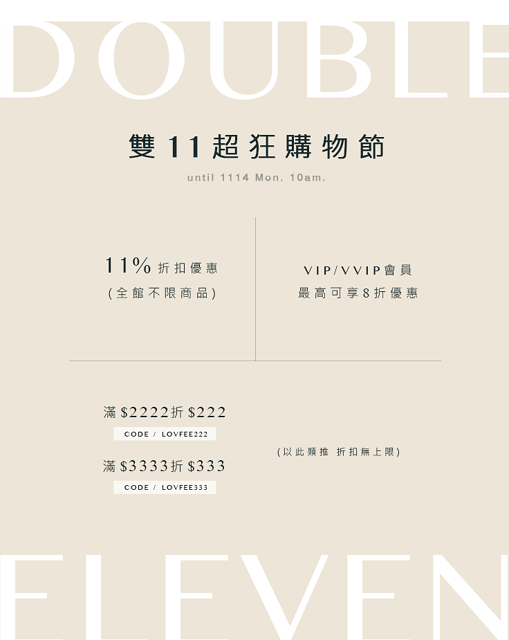 2.訂單滿$2222輸入折扣碼【LOVFEE222】現折$222;訂單滿$3333輸入折扣碼【LOVFEE333】現折$333 (以此類推,折扣無上限)