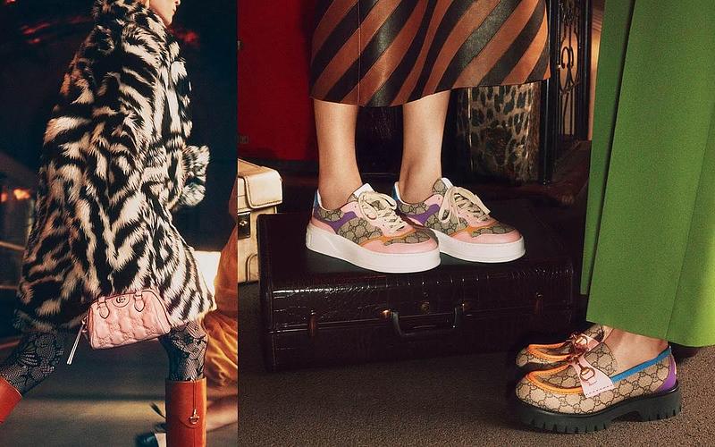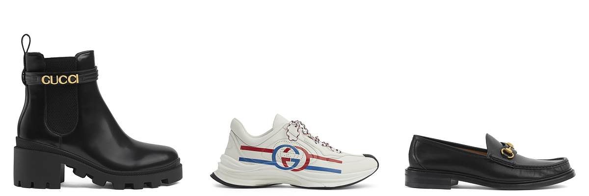 鞋款包括日裝和晚禮服系列。對女性來說,厚實的橡膠底運動鞋和馬銜扣樂福鞋呈現出柔和的粉嫩色調,而一系列顏色的經典靴子則以傳統的細節為特色。飾有GG字母的厚底高跟鞋,閃亮的中高穆勒鞋,和採用紫紅色、檸檬綠和橙色等大膽色調的後綁帶跟鞋則延續Gucci Cosmogonie系列中高級優雅的主題。男士方面,有黑白相間的Gucci Run運動鞋,以及帶有藍色和紅色Interlocking G (互扣G) 細節的白色版本。在晚禮服部分,廣告中展示了飾有黑色馬銜扣細節或銀色Blondie 標誌的黑色漆皮樂福鞋。