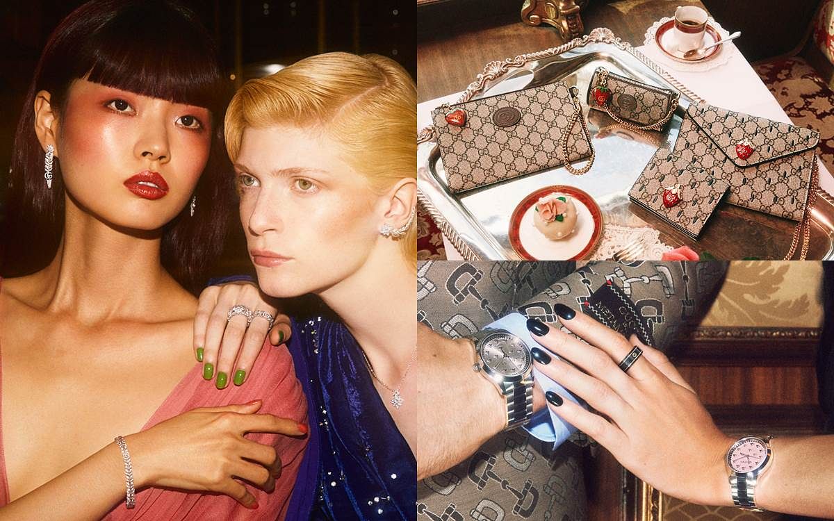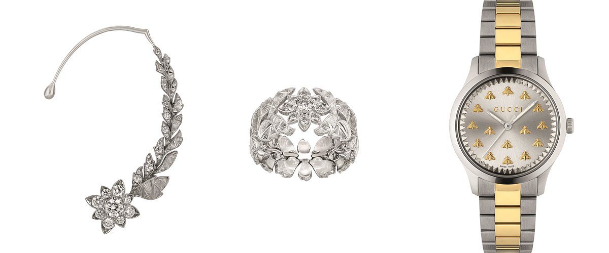 首飾選擇包括以星星圖案和品牌字體為主題的時尚單品。 Gucci Flora 精緻珠寶系列,用 18K 白金和鑽石打造,以大自然為靈感,展現出複雜精緻的細節特色,與廣告的奇幻氛圍相呼應。 G-Timeless腕表的錶盤上裝飾有15隻蜜蜂,同為男士和女士推出,展現出品牌將經典設計與奇思妙想的細節相結合的本能。