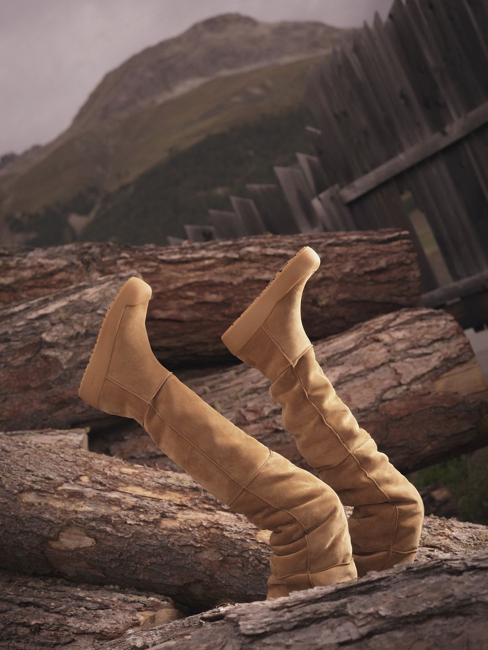 經典的 Bally Curling 靴履作為該膠囊系列的亮點,推出了引人注目的長筒靴,也有隨性慵懶的羊毛翻皮拖鞋,以及從牛仔長靴中汲取靈感,飾以西部圖案的細繩繫帶設計的 Curling 雪地靴,玩轉高級混搭。新款靴履適宜寒冷氣候穿著,選用防水磨面牛皮與橡膠皮革,配以全球目前最先進嚴寒氣候抓地科技的 Arctic Grip® 防滑鞋底。摩登俏皮的配飾系列與 Curling 膠囊系列單品相得益彰,包括羊毛翻皮牛仔色帽子、柔軟的羊毛配麂皮棒球帽、帶皮革裝飾的繭式提花毛毯、飾有絨球的無簷帽以及長毛絨「Switzerland」足球圍巾,將運動功能和時尚元素融入 Bally 的精湛工藝,無論登山探險還是時髦穿搭,皆遊刃有餘。