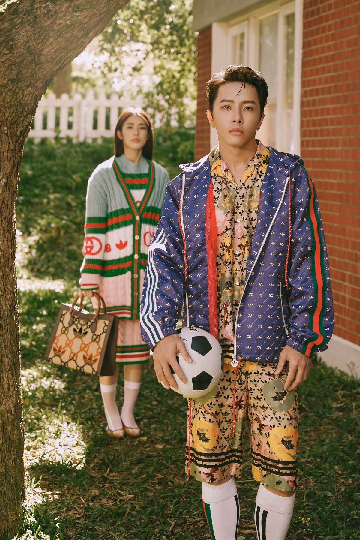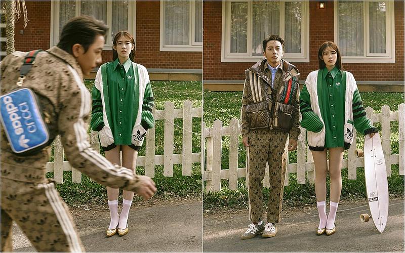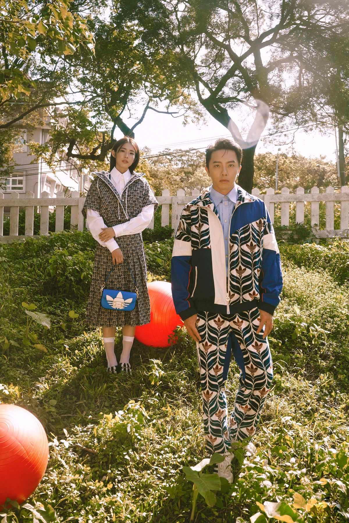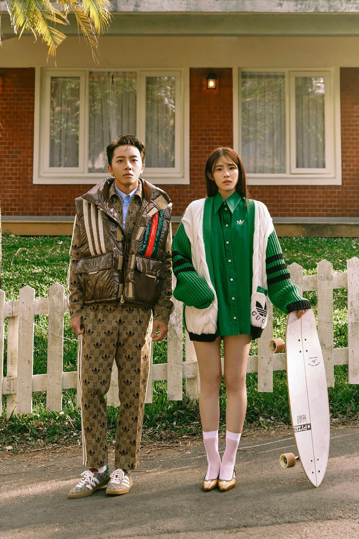思宇穿著一款粉色和粉藍色絞花針織羊毛開襟衫和同款連身洋裝,飾有adidas x Gucci三葉草徽標刺繡和織帶等細節。坤達身穿一套佈滿雙品牌Logo印花的保齡球衫套裝,搭配搶眼的藍紫色運動外套,一側袖子飾有adidas白色三條紋,另一側則飾以Gucci經典的綠紅綠織帶。兩人展現絕佳的運動默契,以動態的姿勢來營造出時髦運動的風格。