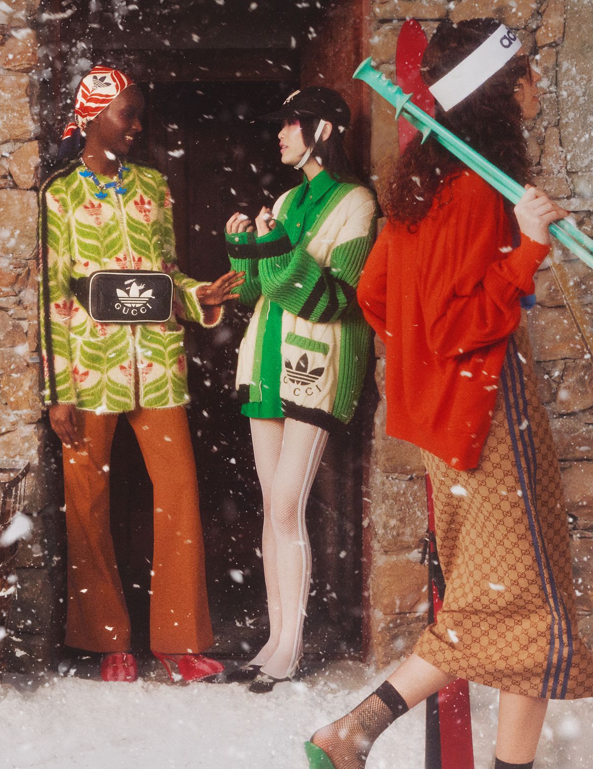 Gucci形象廣告由Mark Peckmezian進行劇照拍攝、Akinola Davies Jr.拍攝形象廣告影片,廣告中展現一群朋友的阿爾卑斯山之旅。探索滑雪時發現的美學,從運動風到細緻設計,風格多樣。服飾從滑雪套裝到戶外服裝配備,包括套裝、針織品、帶有GG字樣的羽絨衣,或是adidas x Gucci的標誌。三五好友沉浸於風景秀麗的山峰和迷人的木屋,放鬆身心,復古的形象廣告體現了該系列產品帶來的舒適愉悅感受。
