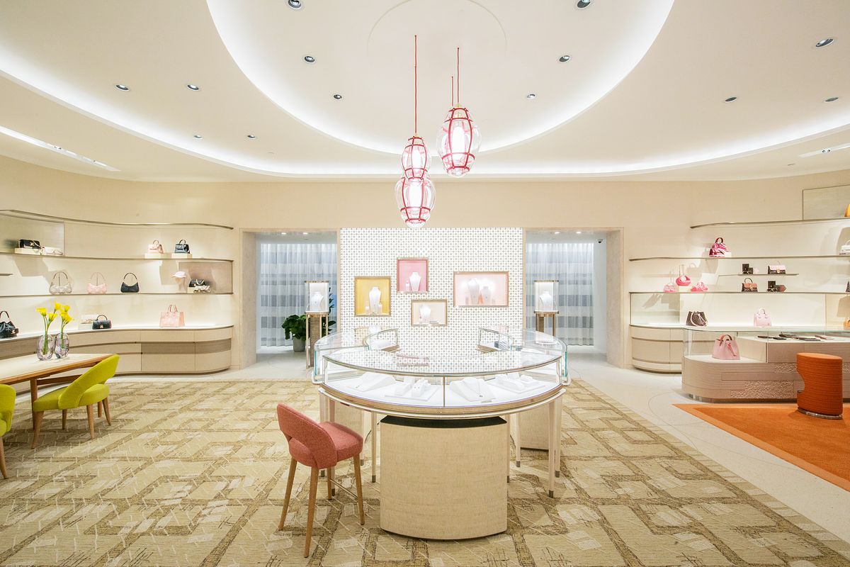 四樓的左側是女士皮件配件區,集結多幅色彩斑斕的藝術畫作,點綴紅色、粉橘色、芥末黃色等傢俱;珠寶與腕錶區牆面閃耀著花朵標誌,融合 Objets Nomades系列的 Aguacate by Campana Brothers 雕塑掛作、Venezia by Marcel Wanders Studio紅色皮革掛燈,流露優雅摩登的氛圍;四樓的右側則是男士專區、旅行主題區與City Guide 旅遊書籍專區,木質的天花板與牆面散發溫潤內斂的氣息,突顯點綴於細節處的現代主義風格的藝術作品,例如 Objets Nomades 的 Totem Lumineux 燈座。