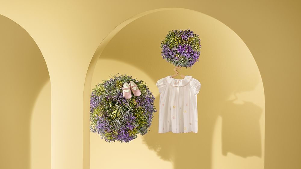 服裝尺寸從出生至 12 個月大,包括連身衣、成套嬰兒服、包臀衣、睡衣、洋裝和雙面連帽外套,口袋上飾有 Monogram 花朵圖紋,內襯為 Meli-Melo 圖案。全系列嬰兒服輕鬆為小寶寶展現別緻可愛的打扮。無論是棉紡喀什米爾開襟羊毛衫上的珍珠母貝鈕扣、寶寶燈籠褲和包臀衣上的小刺繡,還是羅緞上細膩的緹花和印花 Monogram 圖案,都展現出最精細的作工且舒適柔軟質感。