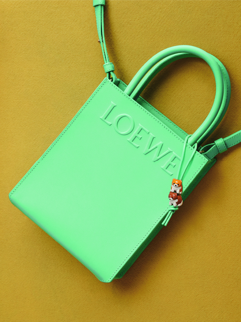 托特包推出光滑小牛皮款式,一系列迷人的馬卡龍色調渲染著整個系列,恬靜沈穩的復古綠、柔美氣質的淺桃色、粉彩雅致的奶油色,再到清新亮眼的薄荷綠;每款設計均壓印上 LOEWE 標誌,並附上可拆、可調式的肩背帶。另外三款棉質T恤綴上刺繡 Anagram標誌,其中一個L字母幻化為愛心,而 520系列更推出鍍金琺瑯博美犬造型掛飾,小巧精緻又可愛的樣貌 令人超級心動,打造最值得珍藏的夢幻禮讚。