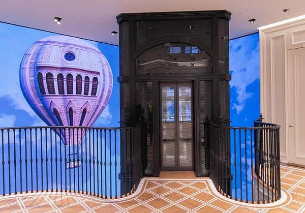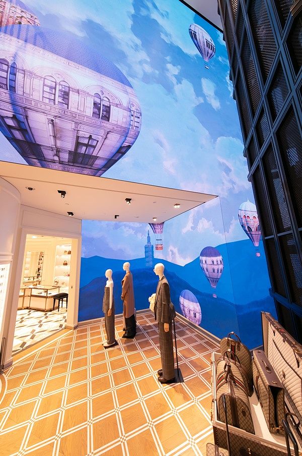 走入店內,可看見高達10米、全世界獨有的LED藝術牆面。慶祝台北101旗艦店開幕,精心打造以「當佛羅倫斯遇見台北」為主題,運用繪畫藝術歌頌著義式情懷與在地台灣文化,強化著品牌與在地的緊密連結。翱翔於湛藍天空的熱氣球,其球面圖騰以品牌發源地佛羅倫斯的聖母百花大教堂為意象、頂端則是代表著教堂的穹頂,而精緻細膩的立面花窗亦是球面亮點;當豐富多彩的熱氣球優雅地劃過天際,自佛羅倫斯開始升空、遨遊於台灣自然景觀最後至台北101大樓;隨著時間推移迎接夜晚,象徵著台灣在地文化的符碼 – 天燈冉冉升起,每盞天燈表面描繪著義大利佛羅倫斯美景並點亮著夜空,好似穿梭於佛羅倫斯與台北的時空幻境。